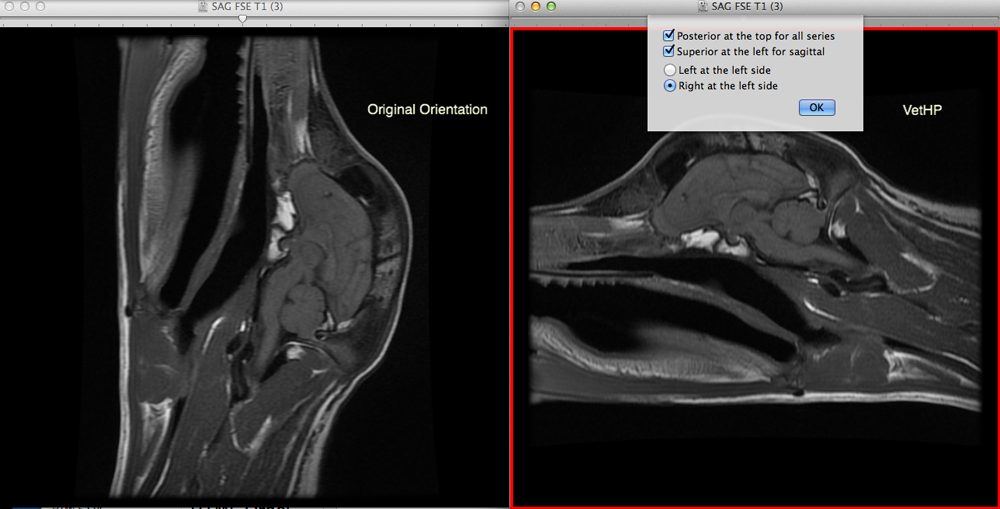 Description: Orient your veterinary CT and MRI images automatically! The Veterinary Hanging Protocol plugin (VetHP) is designed to orient veterinary CT and MRI studies in the way that veterinarians prefer to see them, without adjusting each series by hand. There are three options available to automatically orient transverse, sagittal, and dorsal images consistently, regardless of the scanner used: